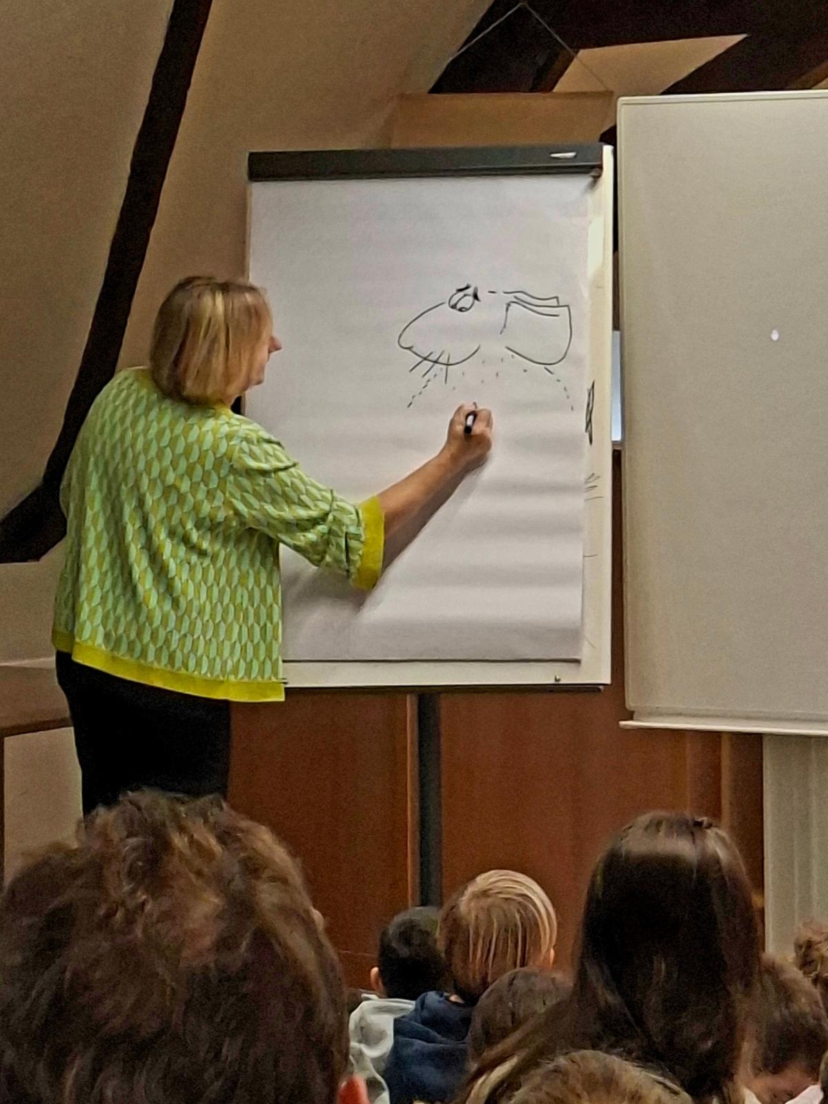 An der Schloss-Schule fand heute für die Kinder der 2. und 3. Klassen eine Lesung mit der Autorin und Illustratorin Ute Krause statt. Dank der Finanzierung durch unseren Förderverein war die Lesung für die Kinder kostenfrei. Frau Krause ist extra aus Hamburg angereist, um 3 Schulen im Kreis Bergstraße zu besuchen. Bei uns zeichnete sie die 4 Hauptfiguren aus den Büchern der Muskeltierreihe und wir konnten bestaunen, mit welch geübten Handschwünge die Tiere endstanden. Außerdem brachte Frau Krause Originalzeichnungen zu den Geschichten ihrer Bücher mit welche im Anschluss bestaunt werden konnten. Sie las für uns heute aus dem ersten Band der "Muskeltier"-Reihe. Wir bedanken uns bei Frau Krause für die schöne Lesung und die Einblicke in die Illustration ihrer Figuren.