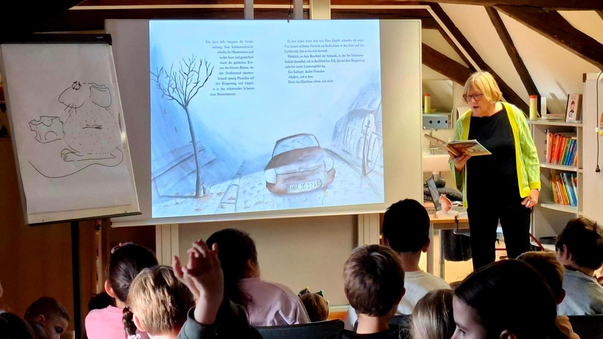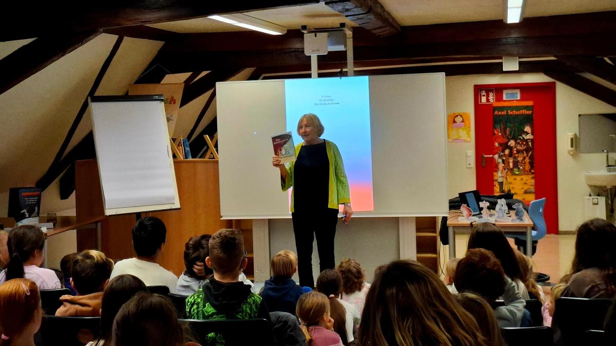 An der Schloss-Schule fand heute für die Kinder der 2. und 3. Klassen eine Lesung mit der Autorin und Illustratorin Ute Krause statt. Dank der Finanzierung durch unseren Förderverein war die Lesung für die Kinder kostenfrei. Frau Krause ist extra aus Hamburg angereist, um 3 Schulen im Kreis Bergstraße zu besuchen. Bei uns zeichnete sie die 4 Hauptfiguren aus den Büchern der Muskeltierreihe und wir konnten bestaunen, mit welch geübten Handschwünge die Tiere endstanden. Außerdem brachte Frau Krause Originalzeichnungen zu den Geschichten ihrer Bücher mit welche im Anschluss bestaunt werden konnten. Sie las für uns heute aus dem ersten Band der "Muskeltier"-Reihe. Wir bedanken uns bei Frau Krause für die schöne Lesung und die Einblicke in die Illustration ihrer Figuren.