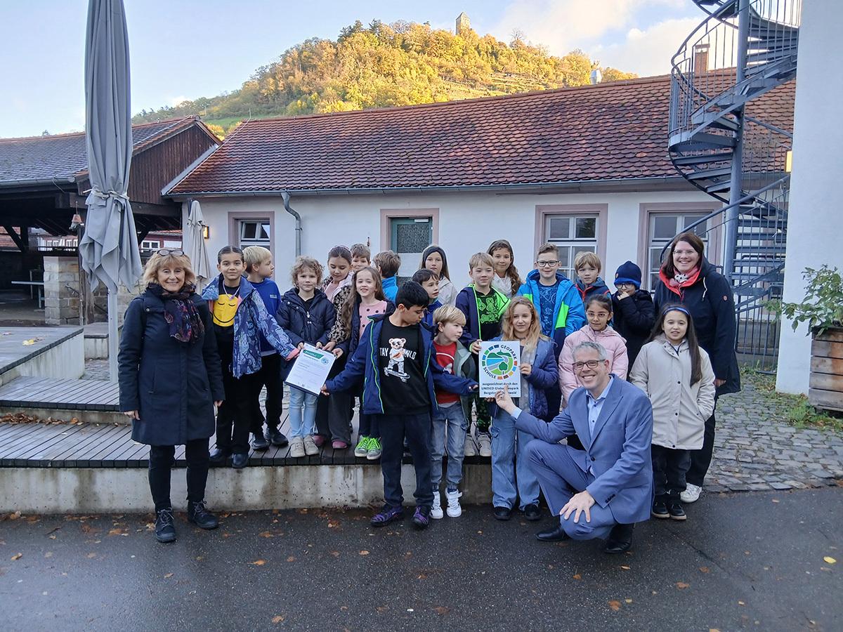 Die Schloss-Schule wurde am 30.10. offiziell als Geopark-Schule ausgezeichnet. Ein Jahr nach Einführung des neuen Konzepts erhielt unsere Grundschule das Zertifikat des UNESCO Global Geopark Bergstraße-Odenwald. Landrat Christian Engelhardt übergab den Kindern der Klasse 2b eine Plakette sowie eine Urkunde als Zeichen der Zertifizierung. Die Geopark-Schule eröffnet uns zusätzliche Lernmöglichkeiten in der Natur und eine Kooperation mit fachkundigen Rangern, die den Kindern viele Naturerfahrungen vermitteln werden. Wir freuen uns auf die Zusammenarbeit mit dem Geo-Naturpark Bergstraße-Odenwald.